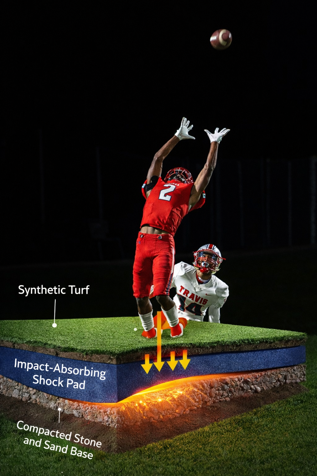 Our ProGuard shock pad layer beneath the turf absorbs and distributes impact forces, reducing the strain on joints, ligaments, and the head. This lowers the risk of injuries like knee or ankle sprains. Second, by cushioning falls, it helps prevent concussions or bruises from hard landings. Finally, the system provides consistent, stable footing, reducing awkward slips or missteps. In short, it’s like a hidden safety net under every play!